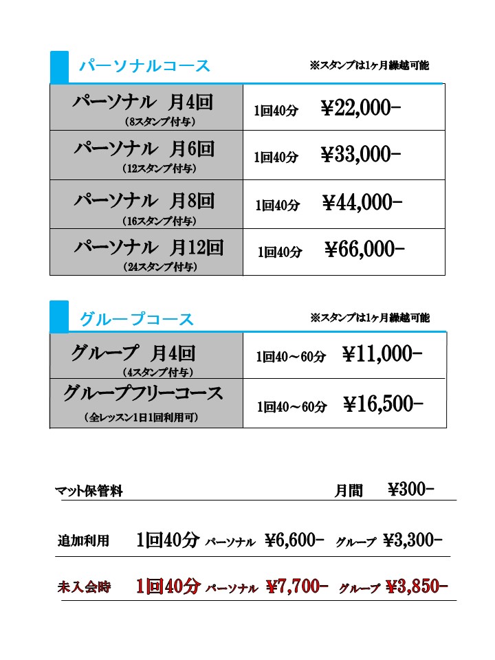 ◆退会後、または月会費制度を利用せずにレッスンを受ける場合は以下の通りとなります。