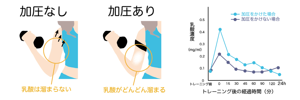 つまり、加圧トレーニングは低負荷の運動の方が乳酸が溜まるということになります。このことからも加圧トレーニングは低負荷でよいということがわかりますね★
