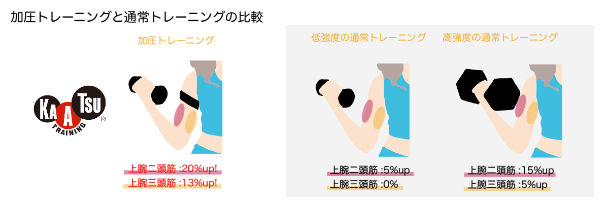 高強度のトレーニングをした時よりも加圧トレーニングで行った時の方が筋肥大の割合が大きい事がわかります。ここからも加圧トレーニングが短期間で結果がでるということがわかりますね!