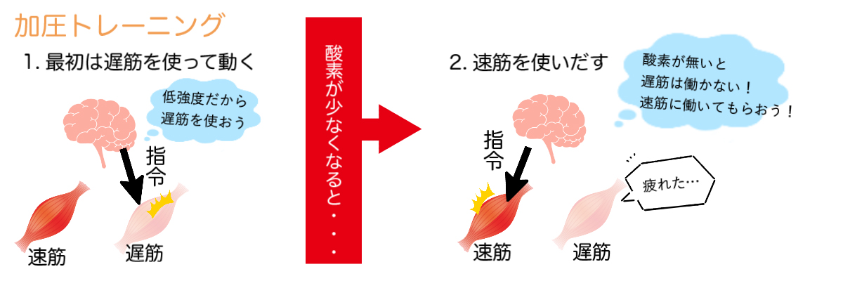 加圧トレーニングは低負荷な運動な為、前半は遅筋使われます。